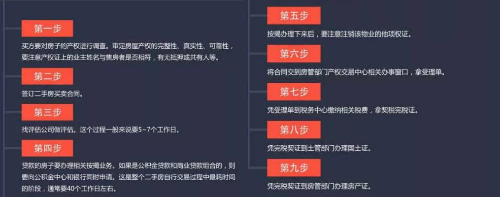 1产 1产权检查 -- 2. 签订合同 --3. 二手房评估--4. 办理按揭--5. 注销物业他项权证--6. 去房管部门申请--7. 缴纳二手房交易税费--8. 办理不动产证--9. 领取不动产证